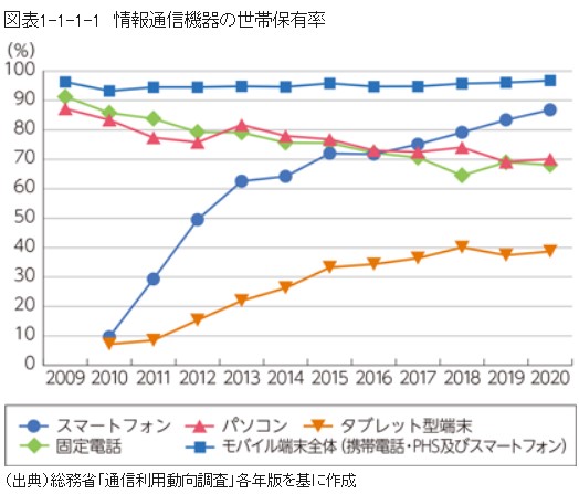 総務省による通信利用動向調査2021年版によると情報通信機器の世帯保有率は9割を超えており、その中でもスマートフォンの普及が8割にまで達しているとのことです。